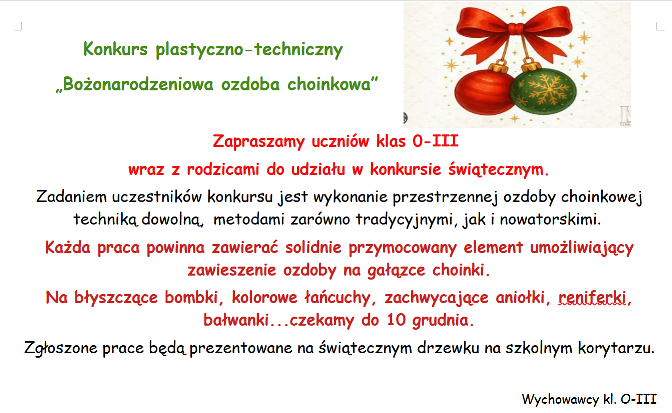 W czwartek 20 listopada 2025 r. w naszej szkole odbędzie się spotkanie rodziców z wychowawcami uczniów klas I - VI i kl. VIII oraz oddziału przedszkolnego o godzinie 17.30.