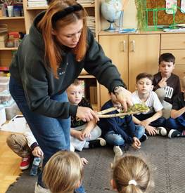 Dnia16.10.2025 w naszej szkole odbył się pokaz zwierząt egzotycznych zorganizowany przez zespół Kreatury. W pokazie wzięły udział dzieci z punktu przedszkolnego Melomiko, dzieci z zerówki oraz uczniowie klas 1-3. Bohaterami spotkania były: jaszczurka agama, kameleon, wąż lancetogłowy oraz żółw. Zwierzęta bardzo spodobały się dzieciom. Maluchy mogły poznać zwierzaka z bliska, dotknąć go, a nawet wziąć na ręce. Ponadto miały też szansę poznać wiele ciekawych informacji z ich życia.